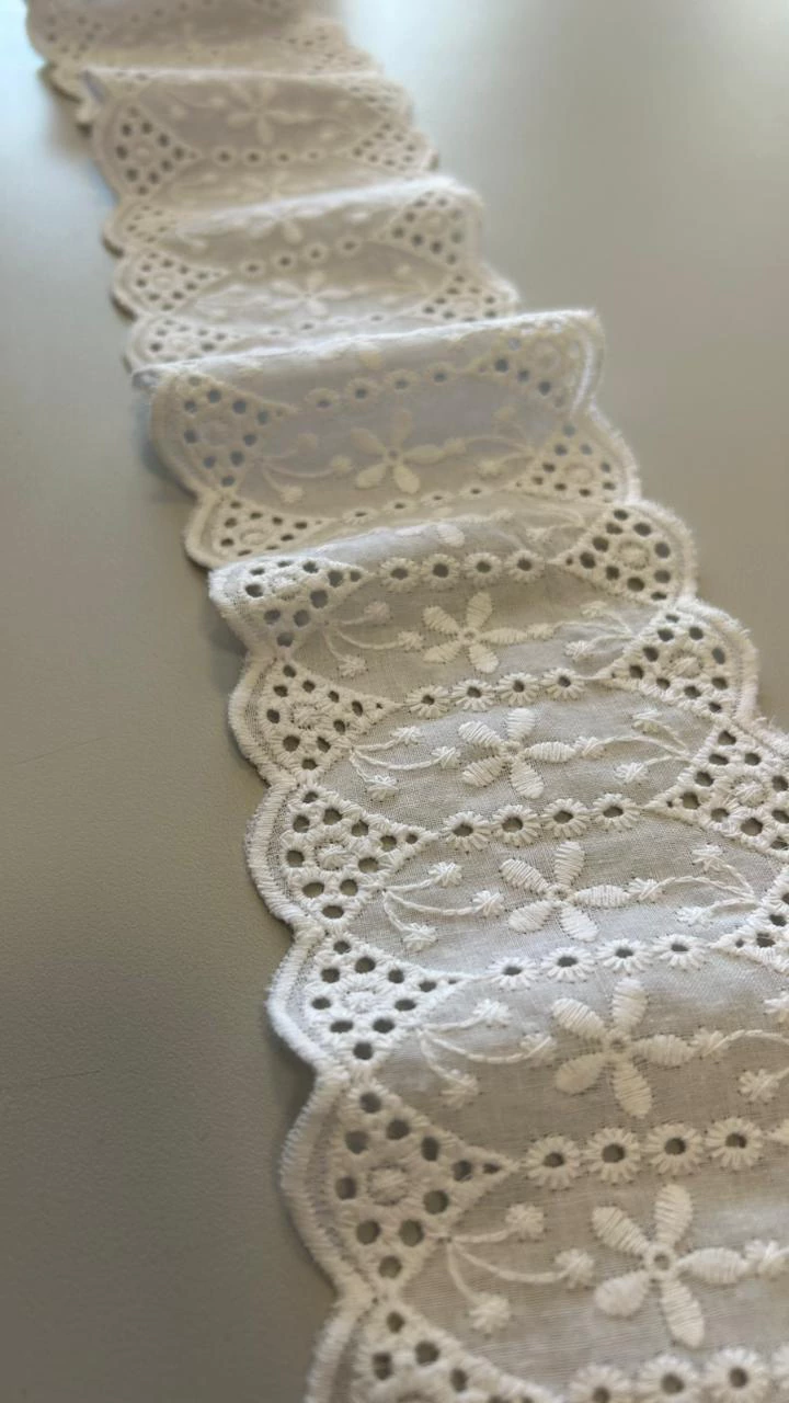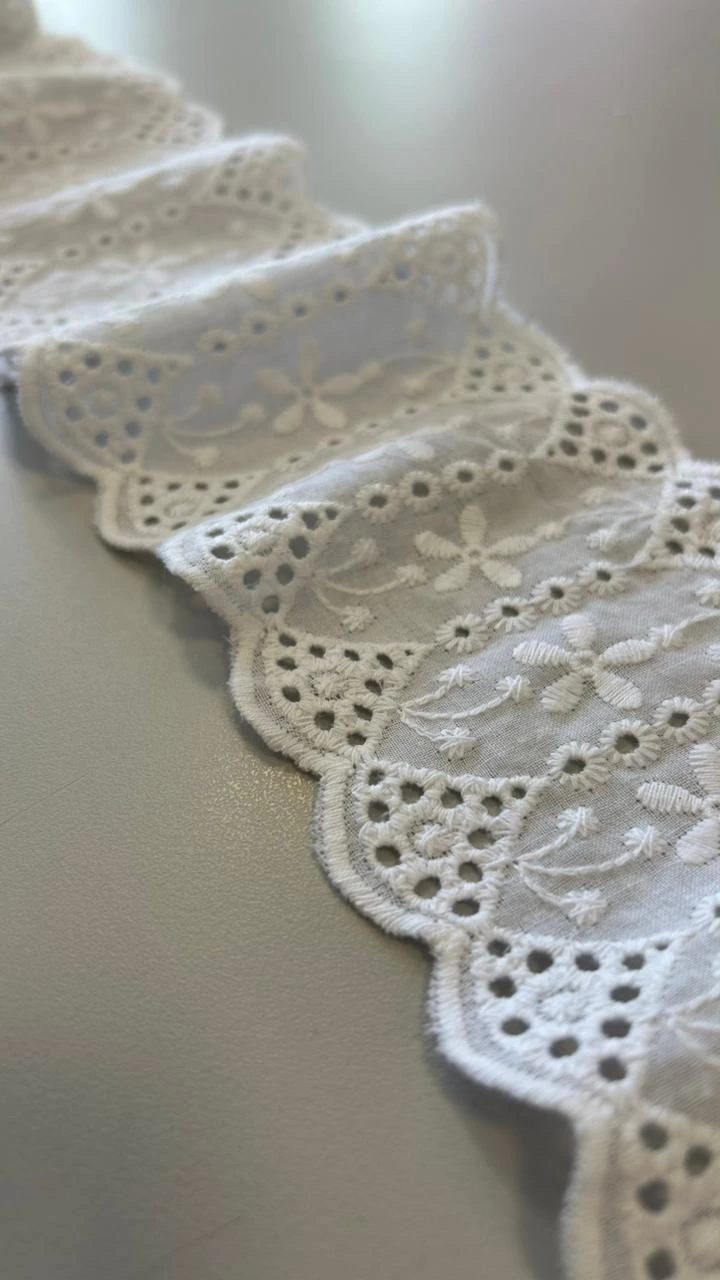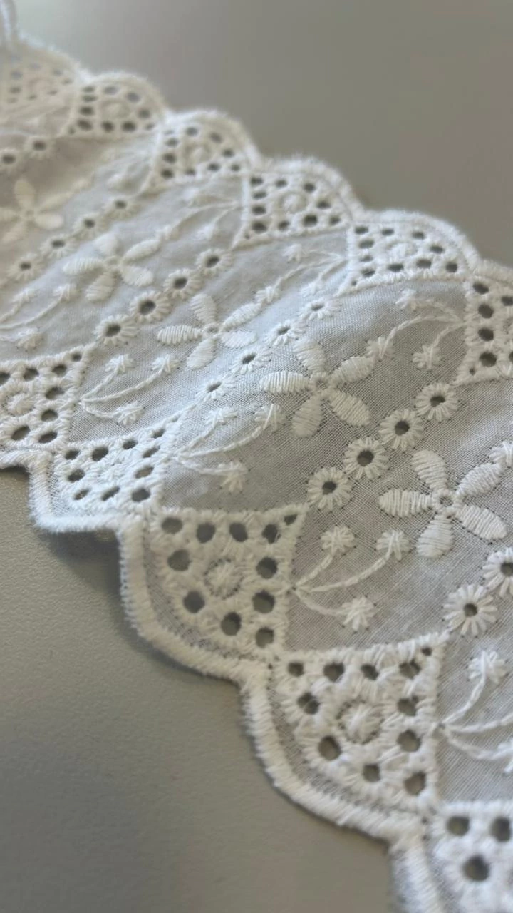 O Bico de Laise é um aviamento usado para acabamento, conhecido por seu acabamento em bordado vazado, que forma desenhos sutis nas bordas. Tradicionalmente confeccionado em algodão, o bico de laise é leve, macio e perfeito para dar um toque romântico e artesanal às peças. Muito utilizado em barrados de vestidos, saias, blusas, camisolas, enxovais e roupas infantis, ele é ideal para compor detalhes que valorizam o acabamento das criações.