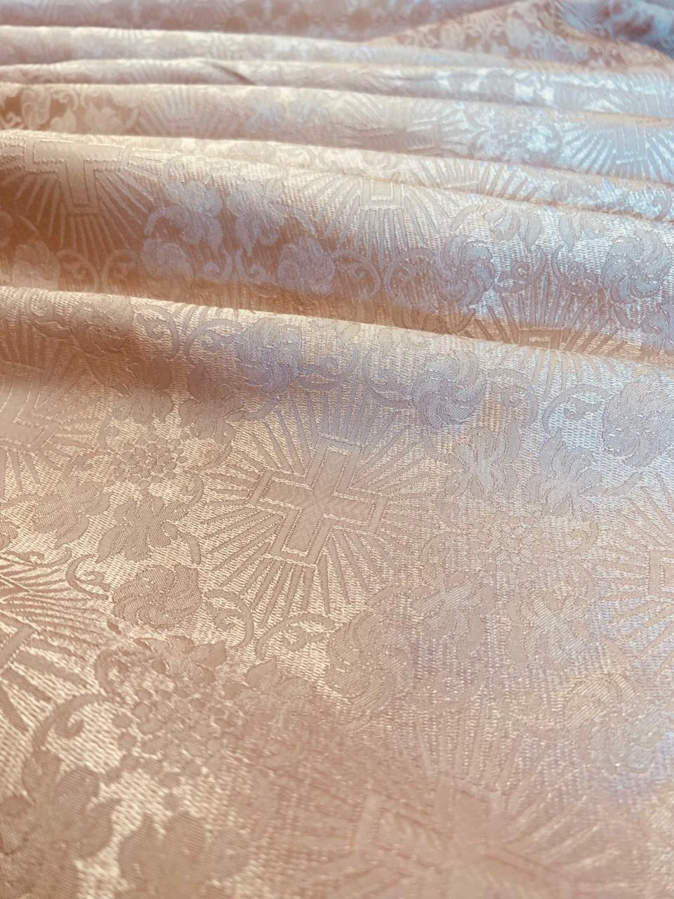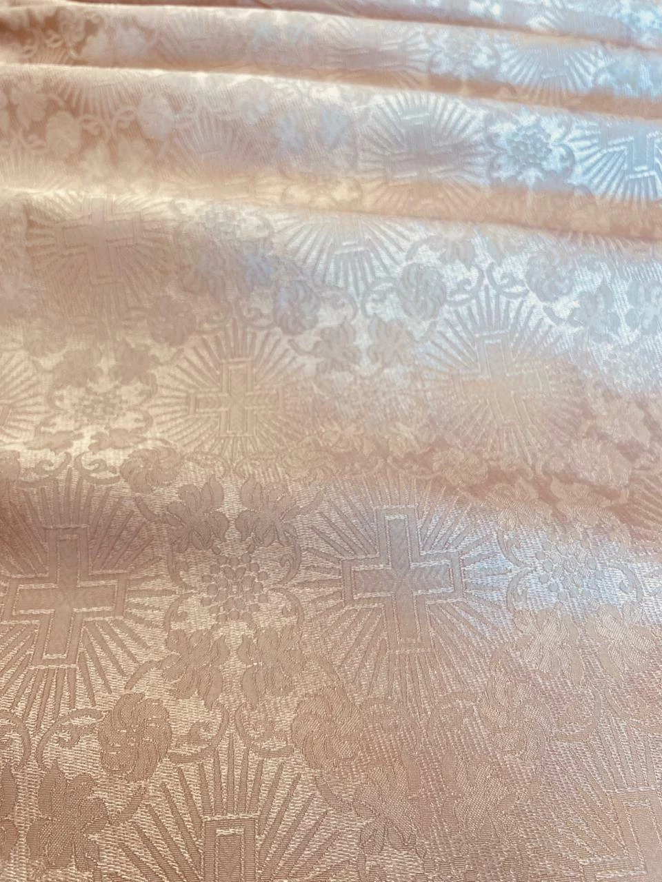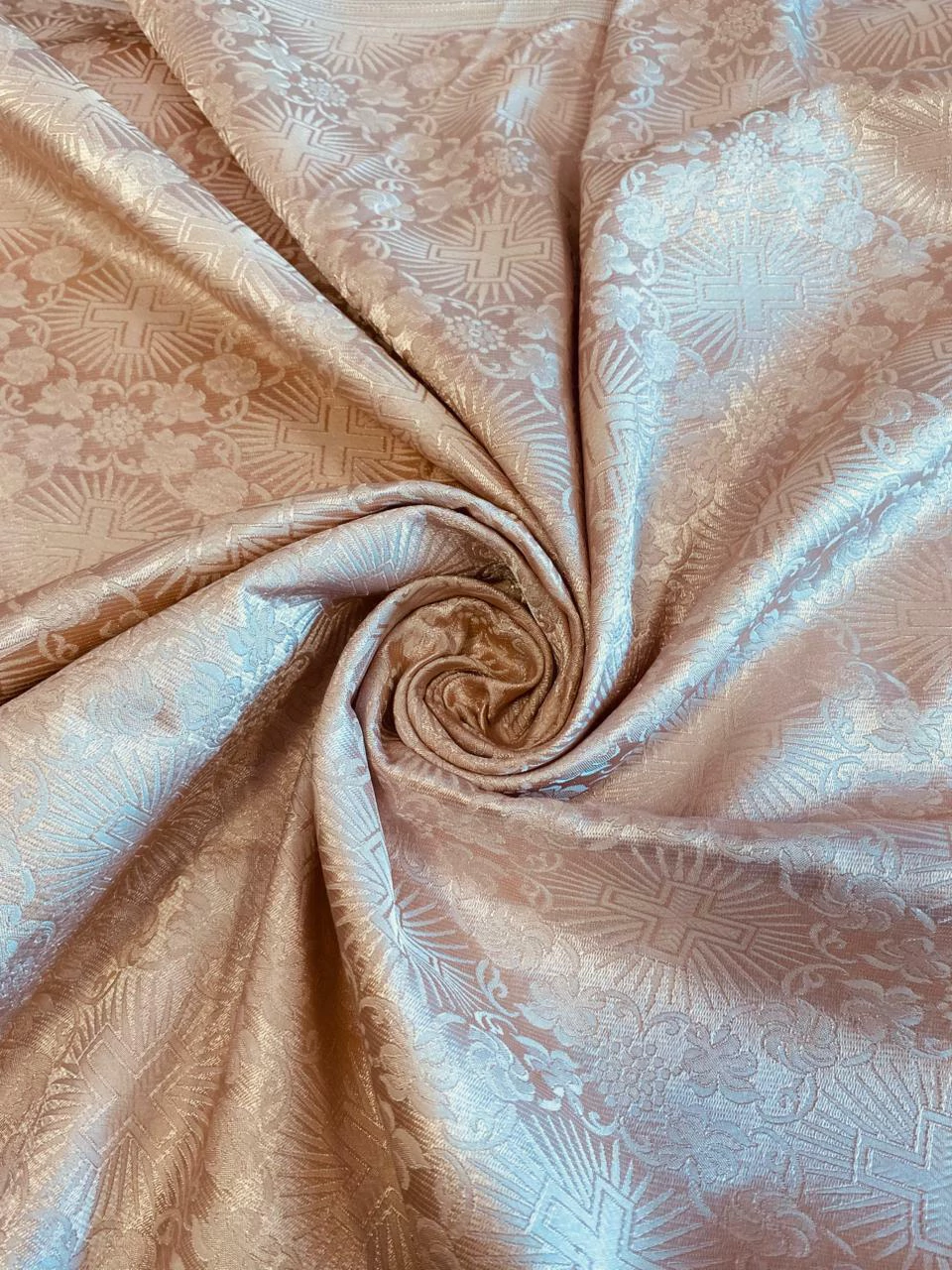 O Jacquard Litúrgico é um tecido com desenhos religiosos ou simbólicos trabalhados diretamente na trama, sem o uso de estampa. Produzido com fios entrelaçados em teares especiais, possui excelente definição de padrões, brilho suave e um toque encorpado. É ideal para vestimentas litúrgicas, como túnicas, estolas, capas, véus, toalhas de altar e ornamentos religiosos em geral. Sua estrutura firme garante um caimento elegante e tradicional, valorizando o simbolismo e a solenidade das peças confeccionadas.