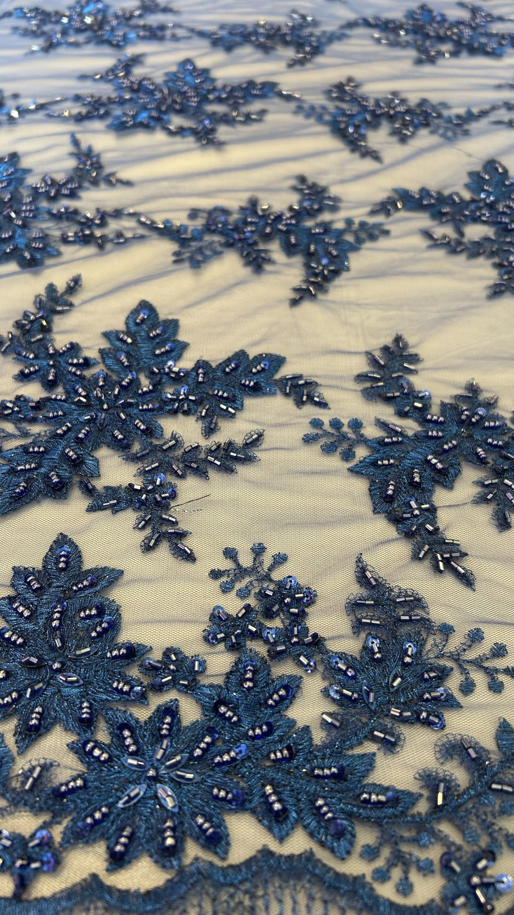 A Renda Bordada com Pedrarias é elegante, sofisticada, clássica, delicada e atemporal, sendo um símbolo dos tecidos mais desejados na moda festa e noiva. Aplicada sobre bases de tule, ela combina a transparência sutil com o brilho refinado das pedrarias, pérolas, e paetês, criando um visual luxuoso.