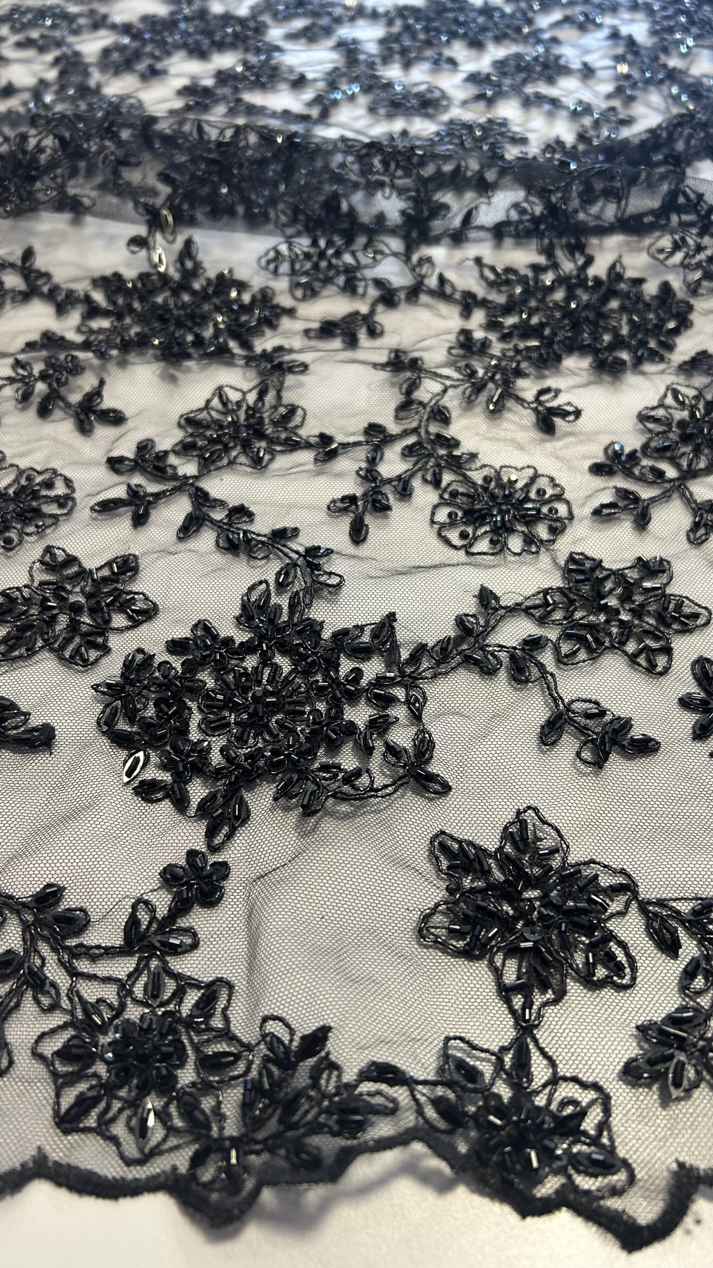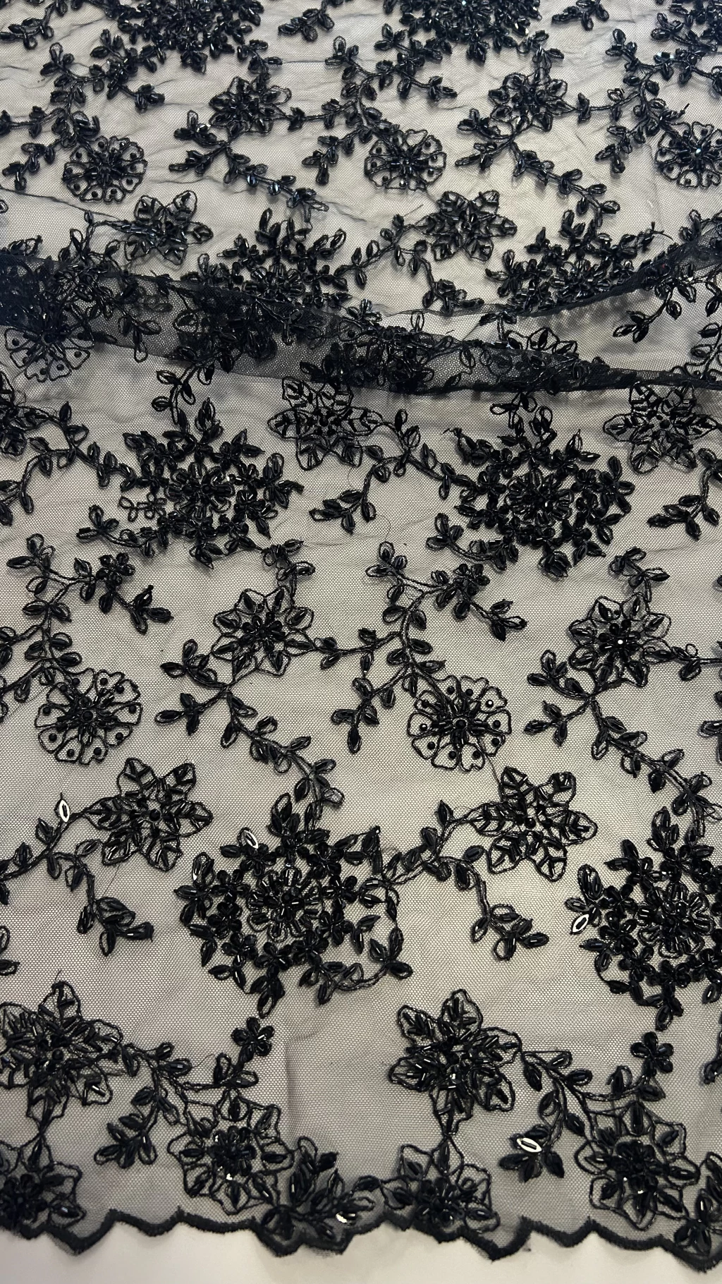 A Renda Bordada com Pedrarias é elegante, sofisticada, clássica, delicada e atemporal, sendo um símbolo dos tecidos mais desejados na moda festa e noiva. Aplicada sobre bases de tule, ela combina a transparência sutil com o brilho refinado das pedrarias, pérolas, e paetês, criando um visual luxuoso.