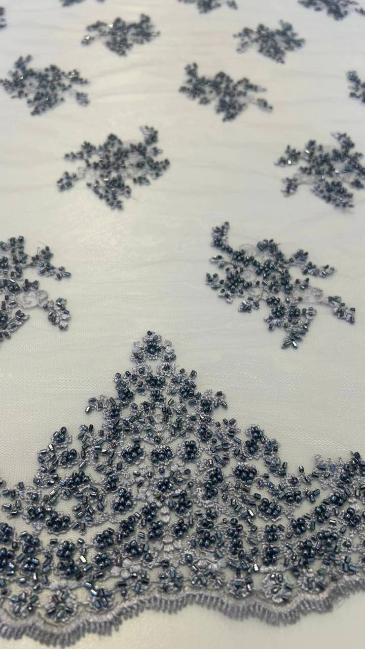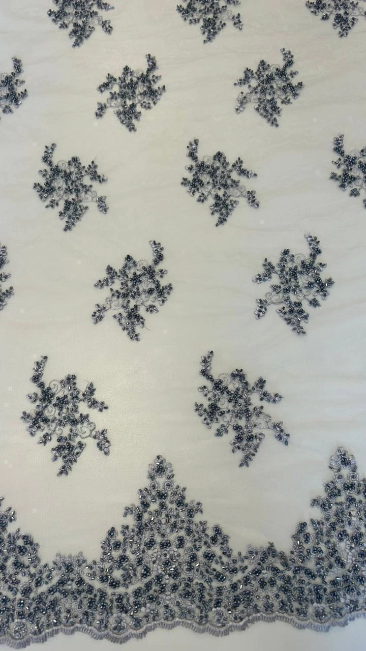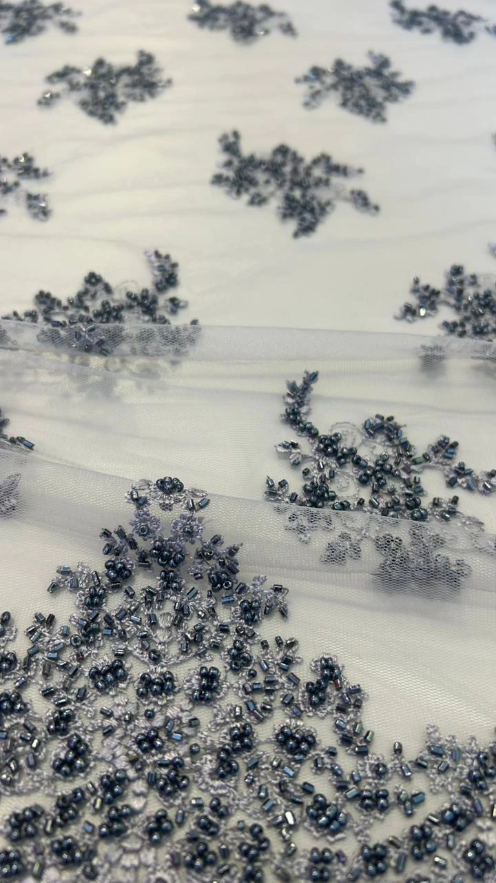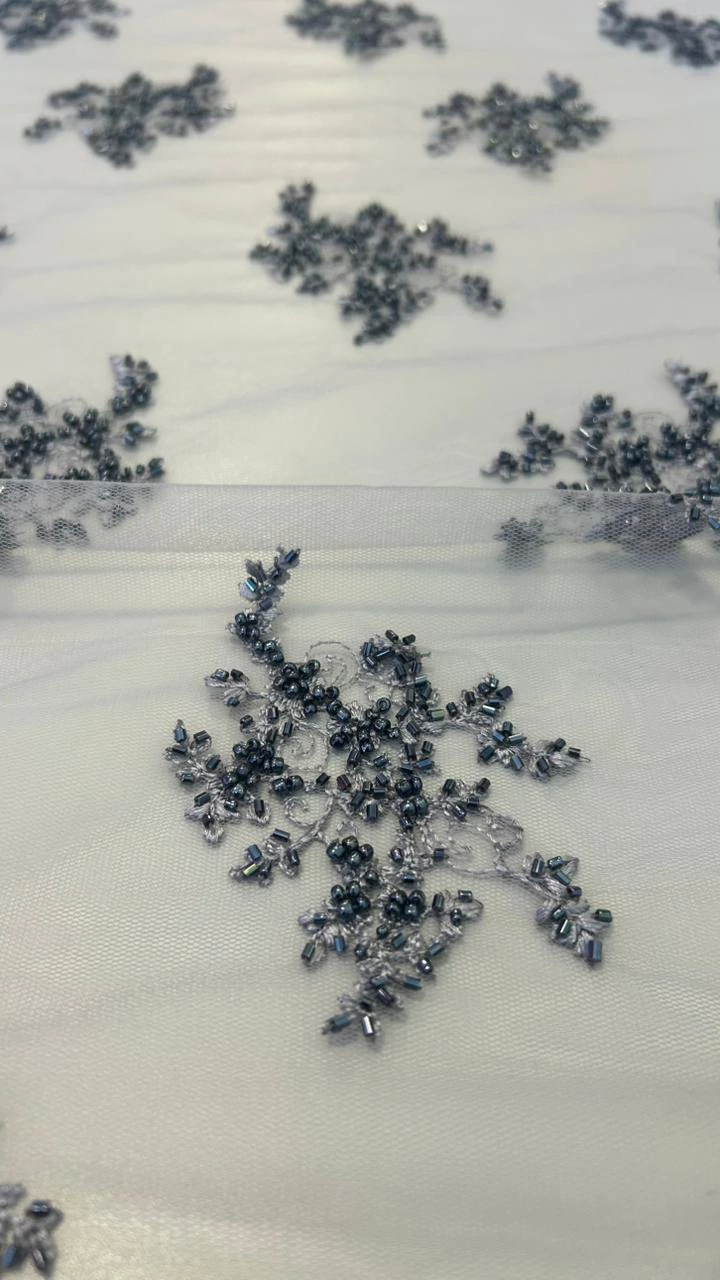A Renda Bordada com Pedrarias é elegante, sofisticada, clássica, delicada e atemporal, sendo um símbolo dos tecidos mais desejados na moda festa e noiva. Aplicada sobre bases de tule, ela combina a transparência sutil com o brilho refinado das pedrarias, pérolas, e paetês, criando um visual luxuoso.