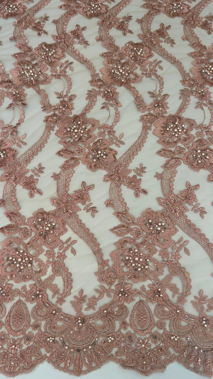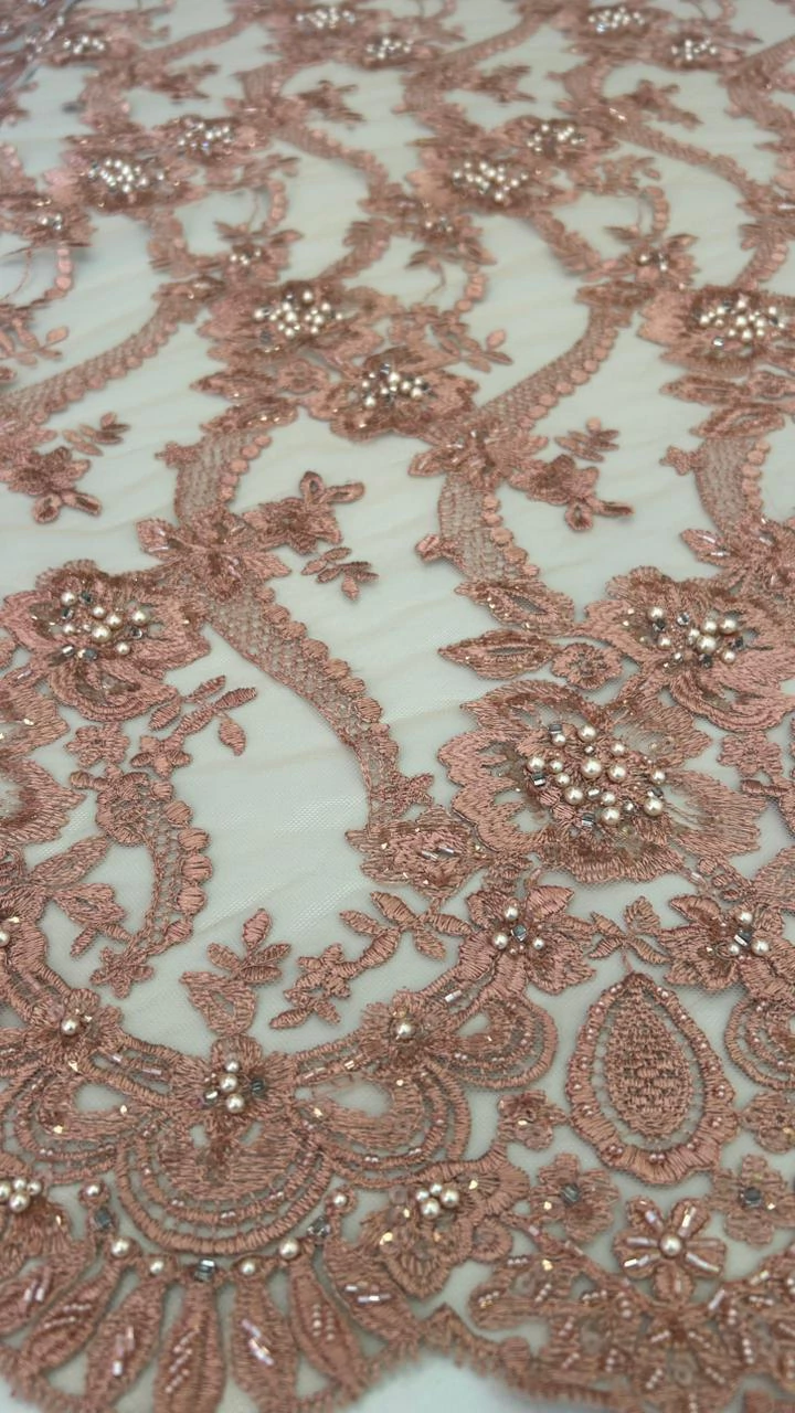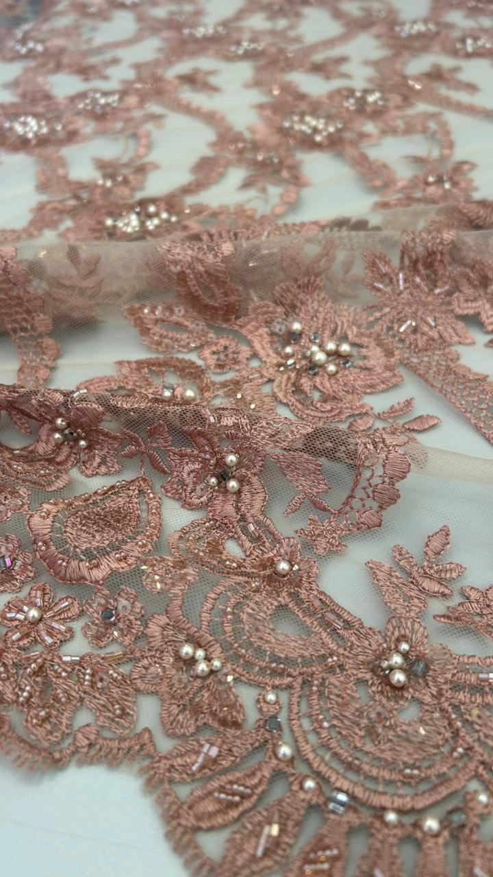 A Renda Bordada com Pedrarias é elegante, sofisticada, clássica, delicada e atemporal, sendo um símbolo dos tecidos mais desejados na moda festa e noiva. Aplicada sobre bases de tule, ela combina a transparência sutil com o brilho refinado das pedrarias, pérolas, e paetês, criando um visual luxuoso.