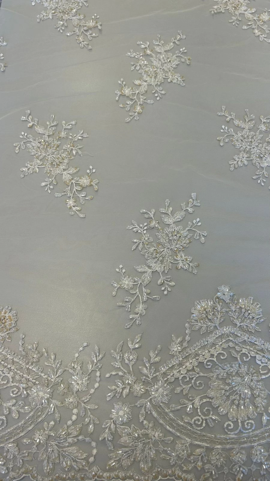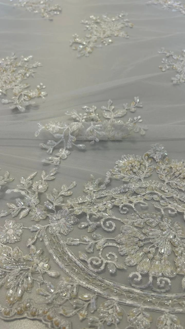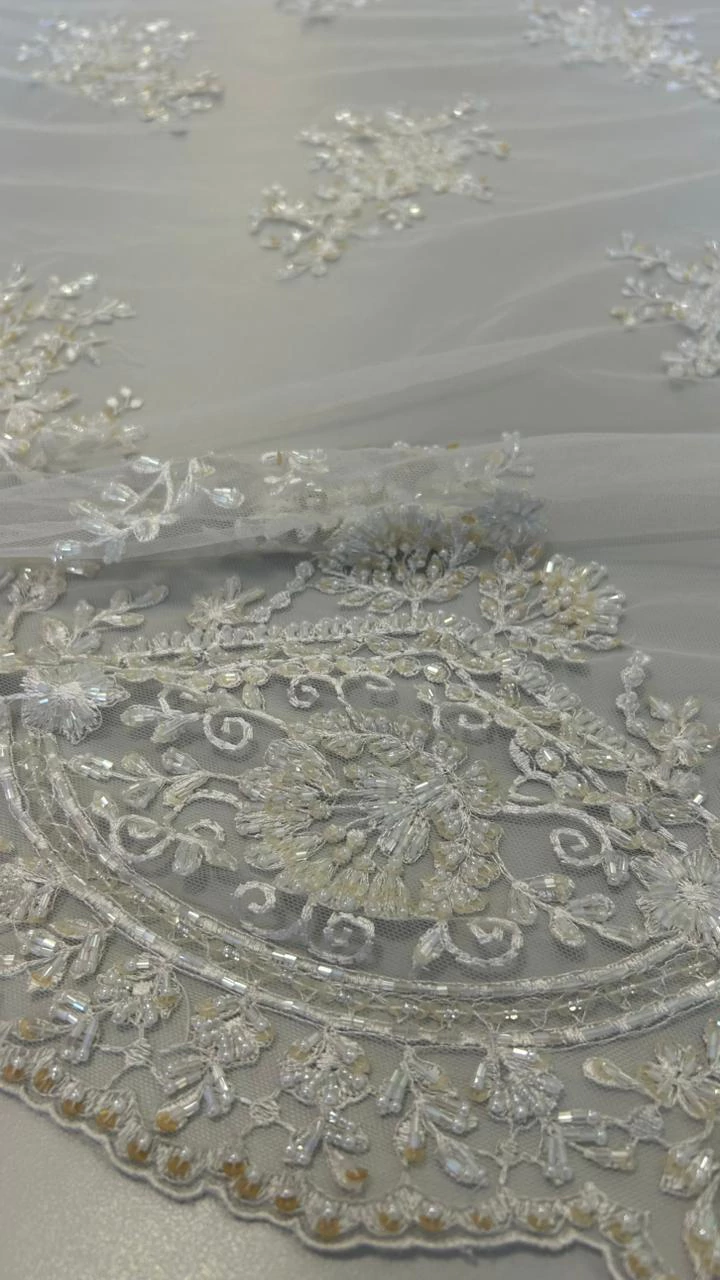 A Renda Bordada com Pedrarias é elegante, sofisticada, clássica, delicada e atemporal, sendo um símbolo dos tecidos mais desejados na moda festa e noiva. Aplicada sobre bases de tule, ela combina a transparência sutil com o brilho refinado das pedrarias, pérolas, e paetês, criando um visual luxuoso.