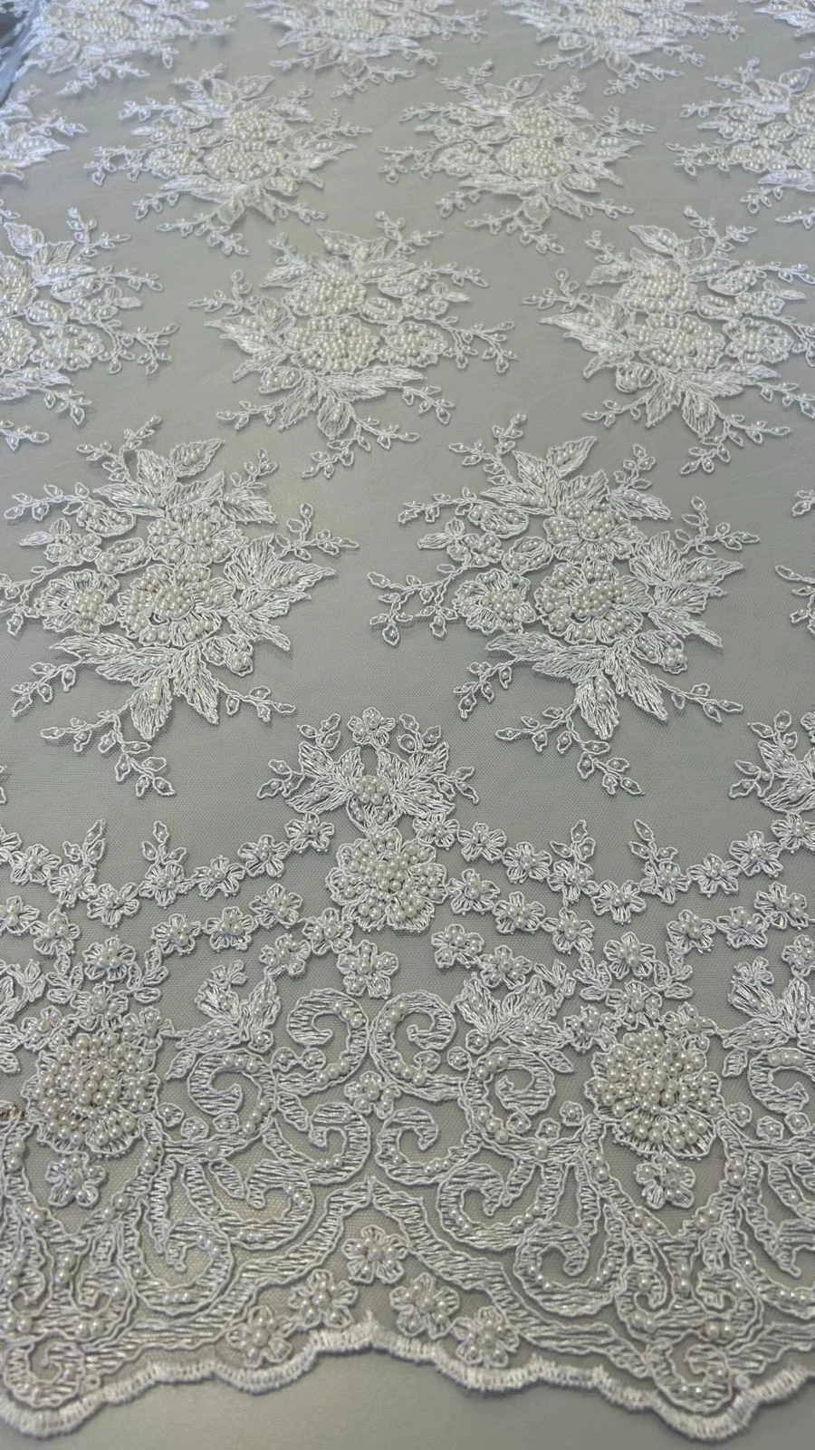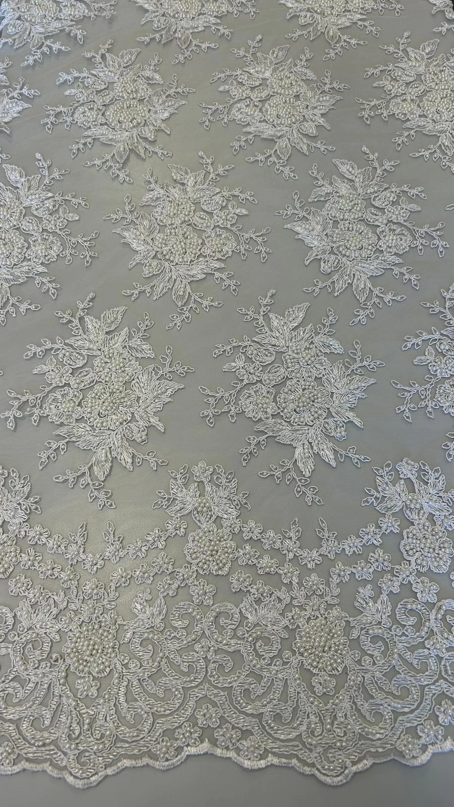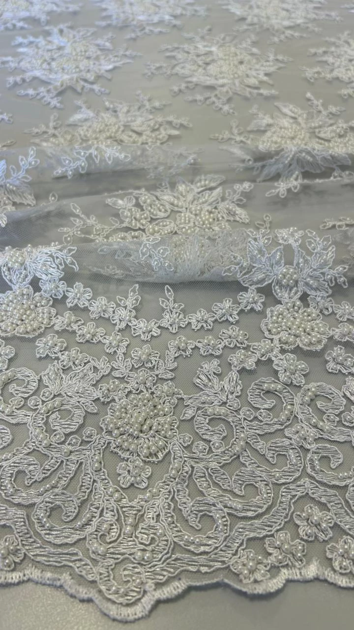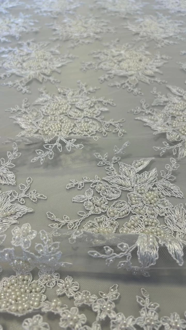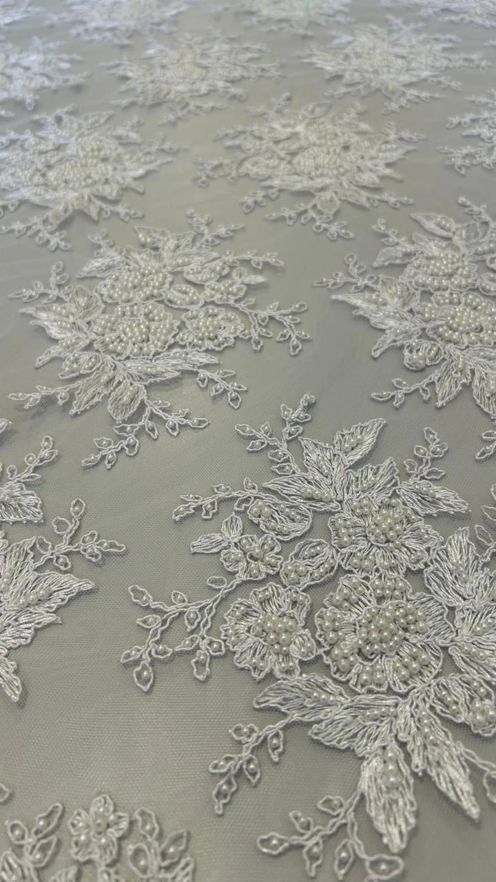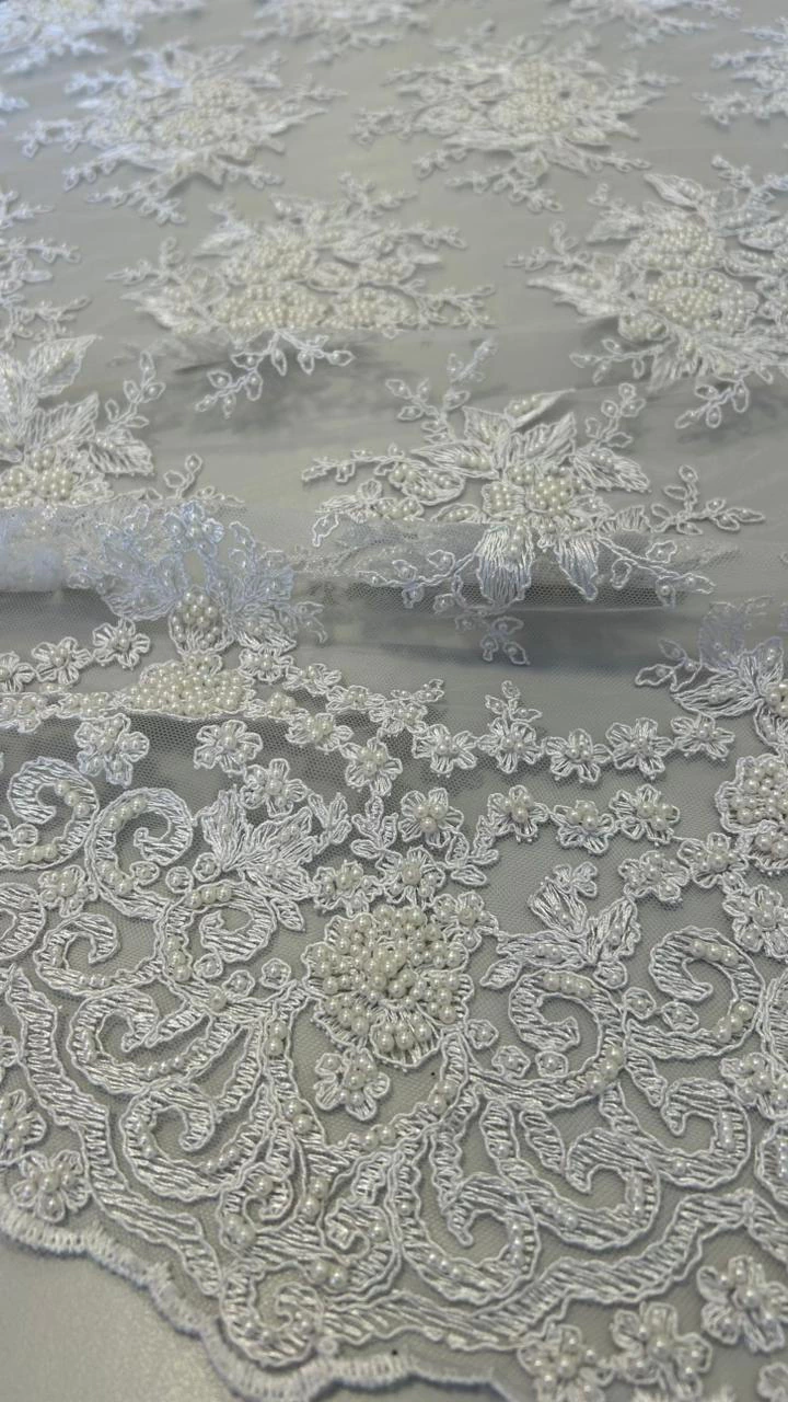 A Renda Bordada com Pedrarias é elegante, sofisticada, clássica, delicada e atemporal, sendo um símbolo dos tecidos mais desejados na moda festa e noiva. Aplicada sobre bases de tule, ela combina a transparência sutil com o brilho refinado das pedrarias, pérolas, e paetês, criando um visual luxuoso.