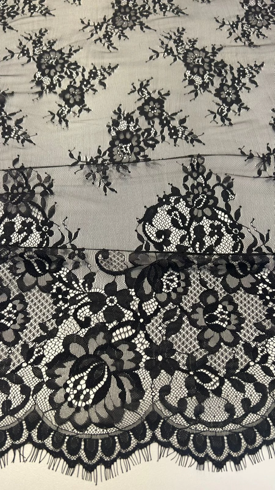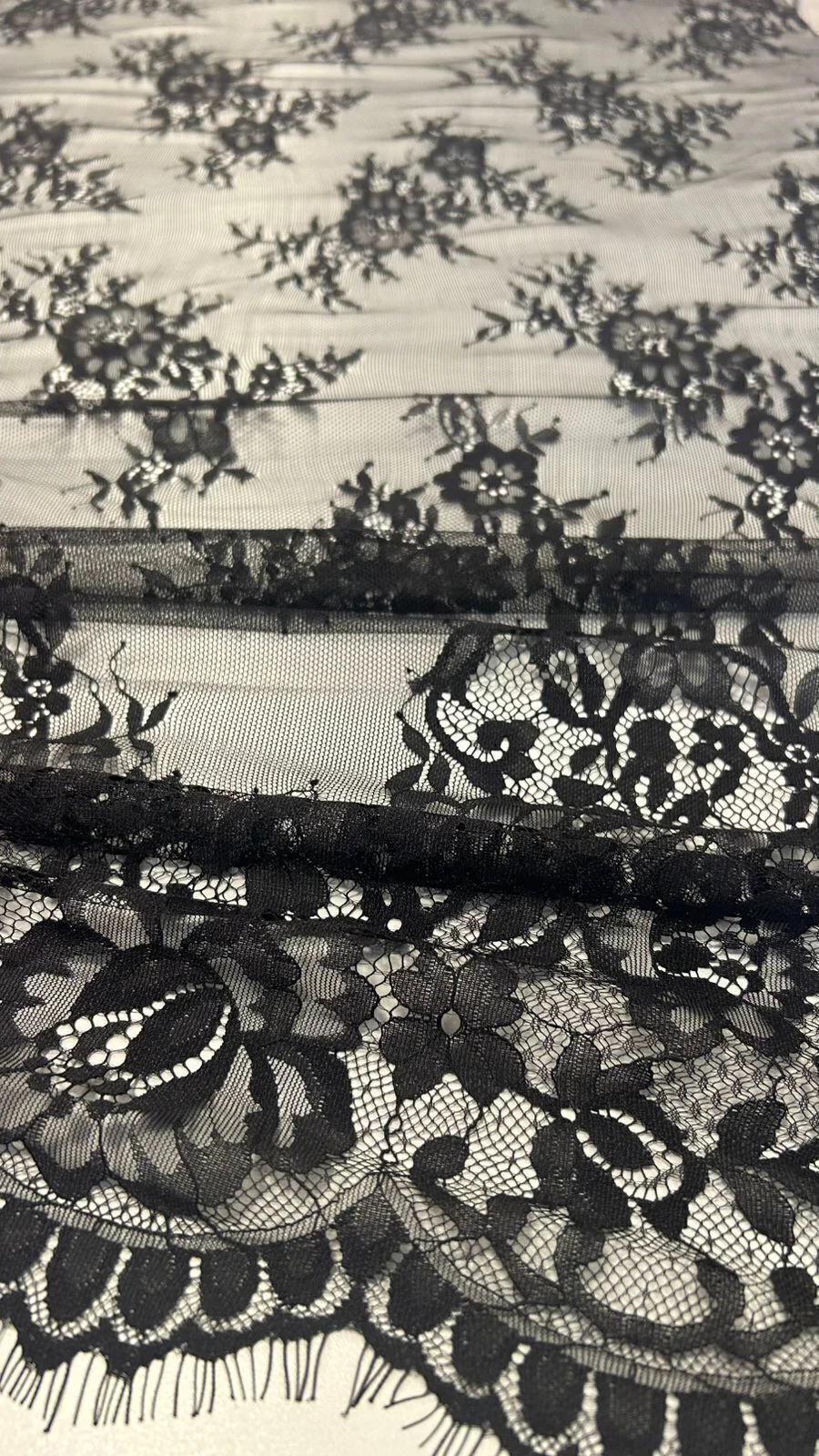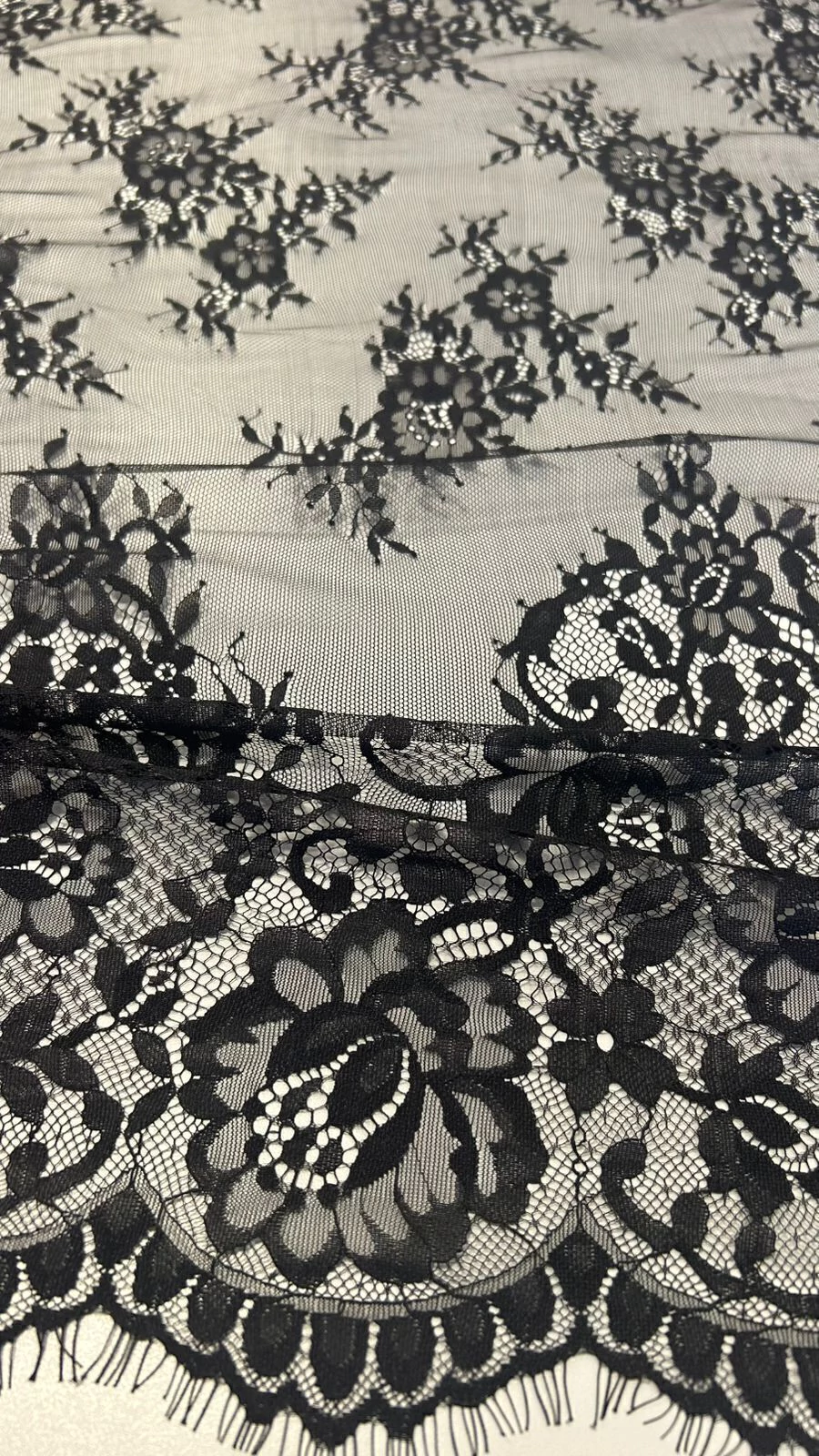 A Renda Chantilly é leve, delicada e extremamente sofisticada. Perfeita para vestidos de noiva, festa e detalhes refinados. Possui toque macio, caimento fluido e desenhos florais que traduzem romantismo e elegância. Renda em cortes de 3,00m (300cm), valor do metro R$100,00/m.