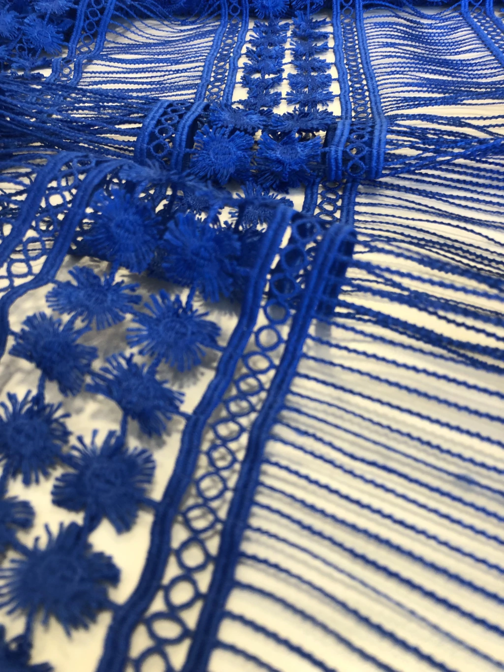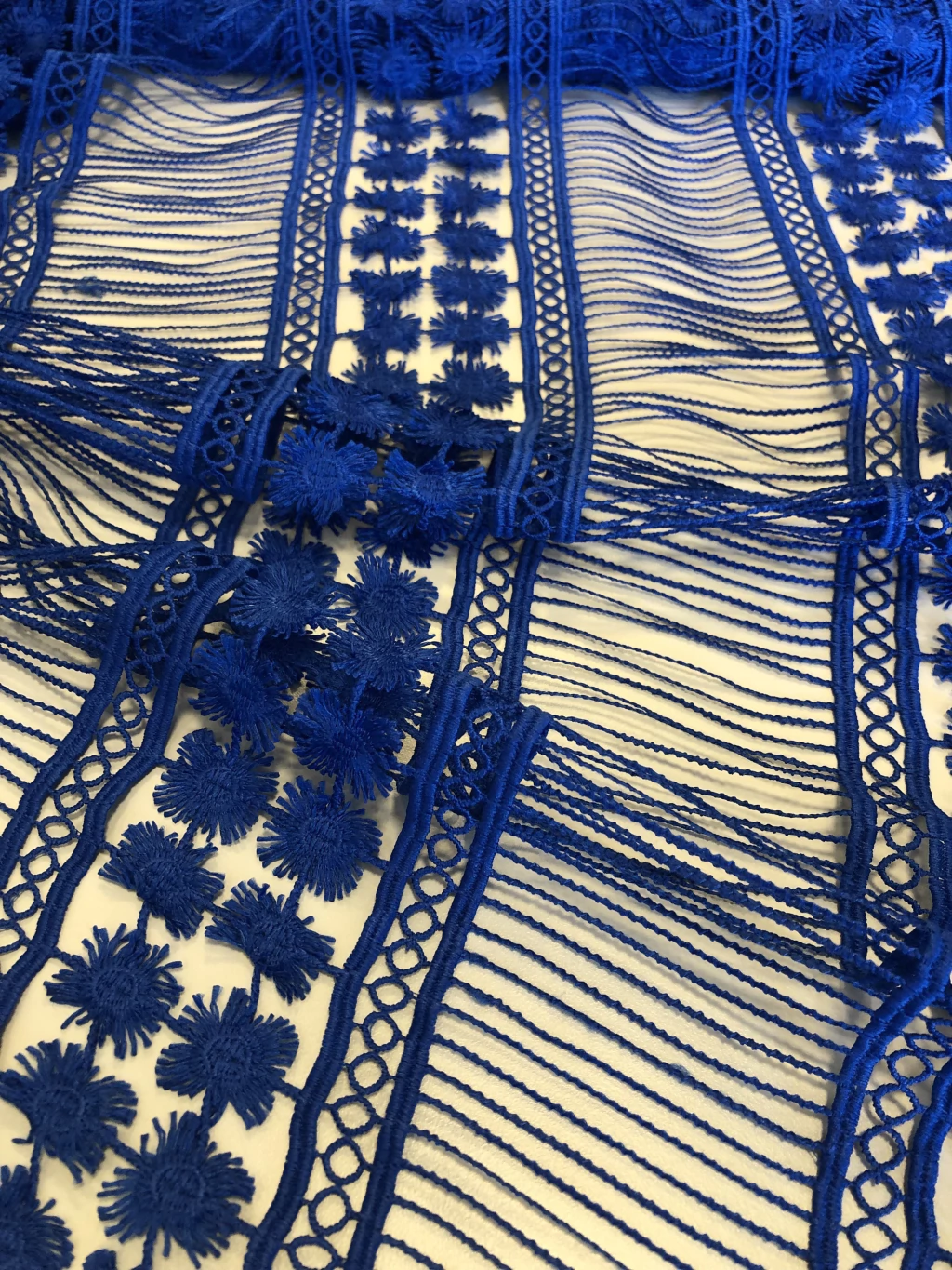 A Renda Guipure é um tecido conhecido por seus desenhos em relevo formados por fios trabalhados, sem fundo de tule. Rica em detalhes, possui aspecto rendado mais firme e estruturado, trazendo elegância e requinte às peças. É muito utilizada em vestidos de festa, noivas, detalhes em blusas, saias, aplicações e até em combinações com outros tecidos delicados.