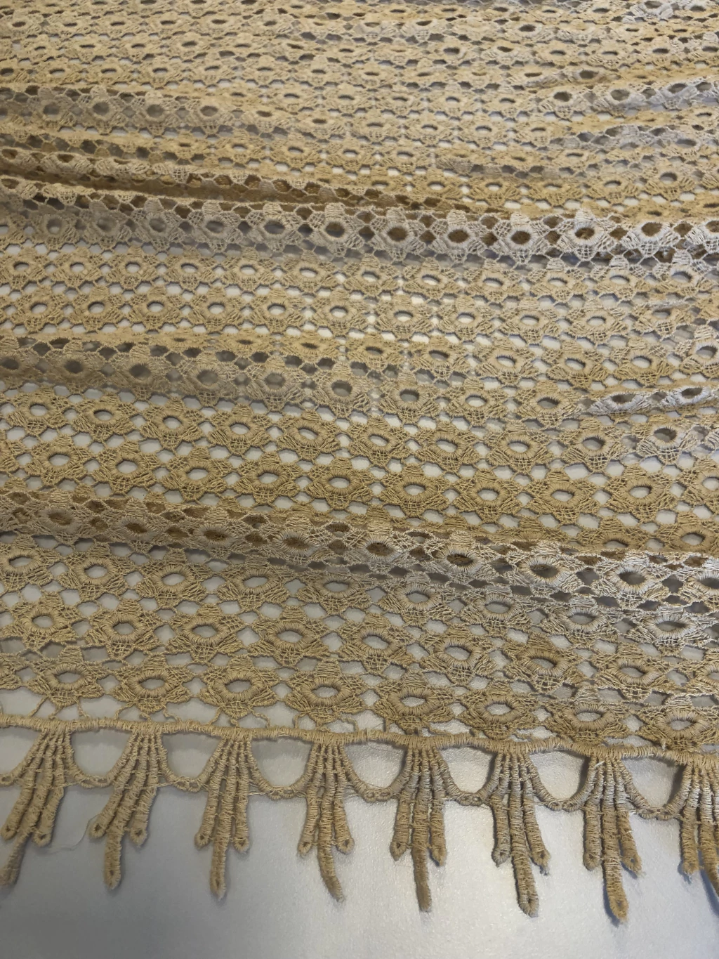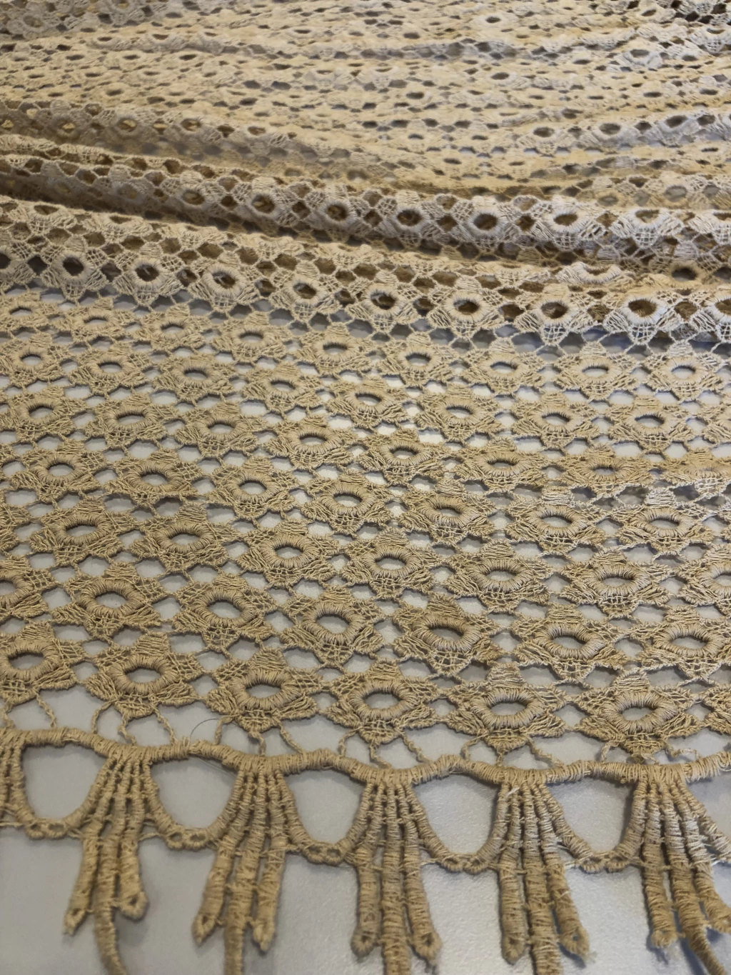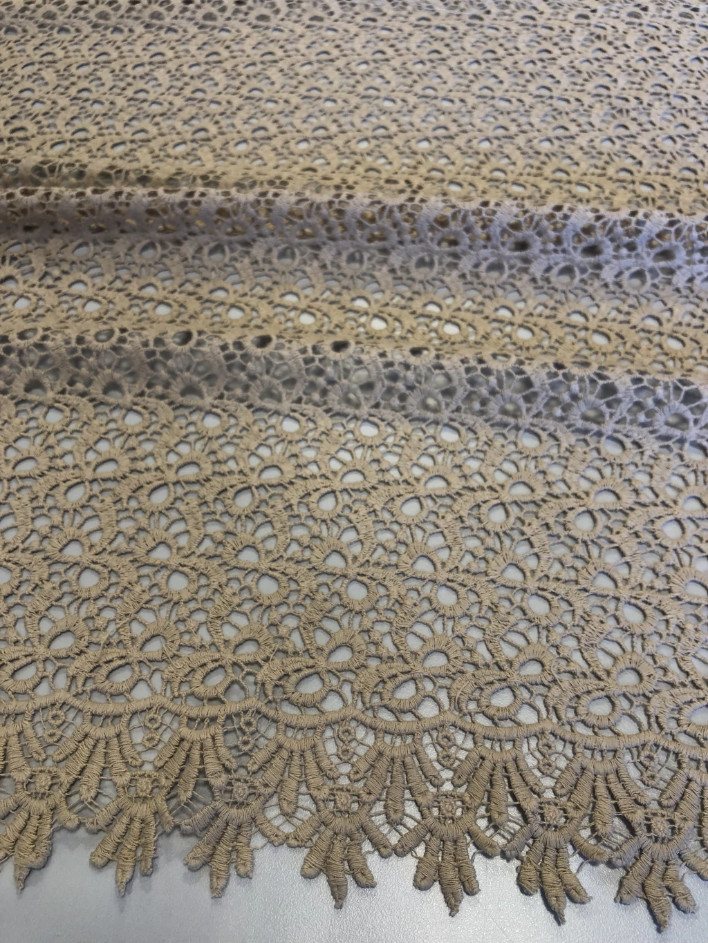 A Renda Guipure é um tecido conhecido por seus desenhos em relevo formados por fios trabalhados, sem fundo de tule. Rica em detalhes, possui aspecto rendado mais firme e estruturado, trazendo elegância e requinte às peças. É muito utilizada em vestidos de festa, noivas, detalhes em blusas, saias, aplicações e até em combinações com outros tecidos delicados.
