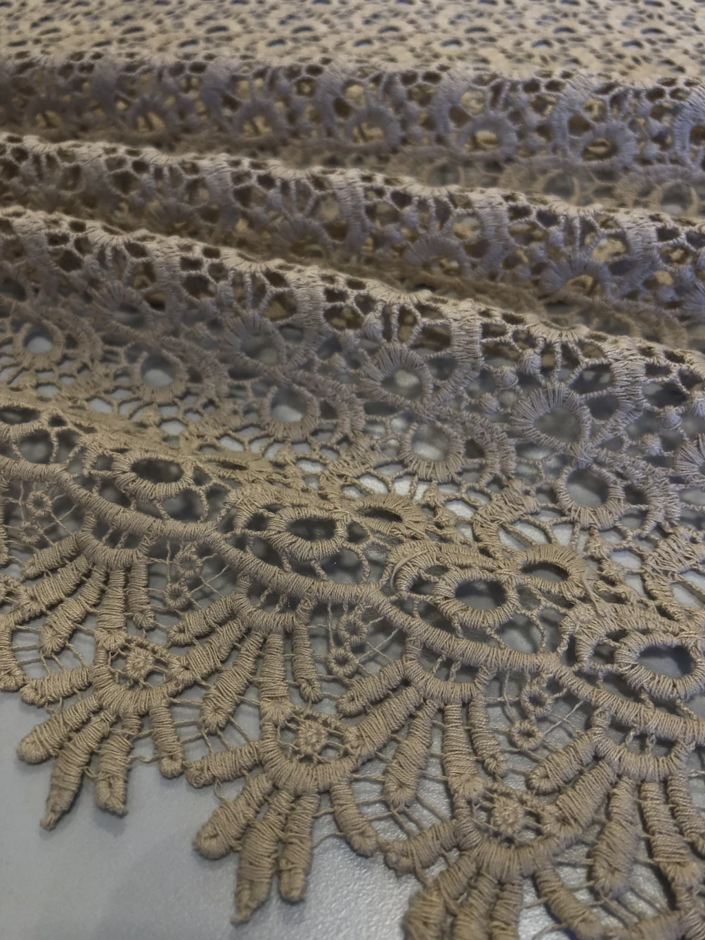 A Renda Guipure é um tecido conhecido por seus desenhos em relevo formados por fios trabalhados, sem fundo de tule. Rica em detalhes, possui aspecto rendado mais firme e estruturado, trazendo elegância e requinte às peças. É muito utilizada em vestidos de festa, noivas, detalhes em blusas, saias, aplicações e até em combinações com outros tecidos delicados.