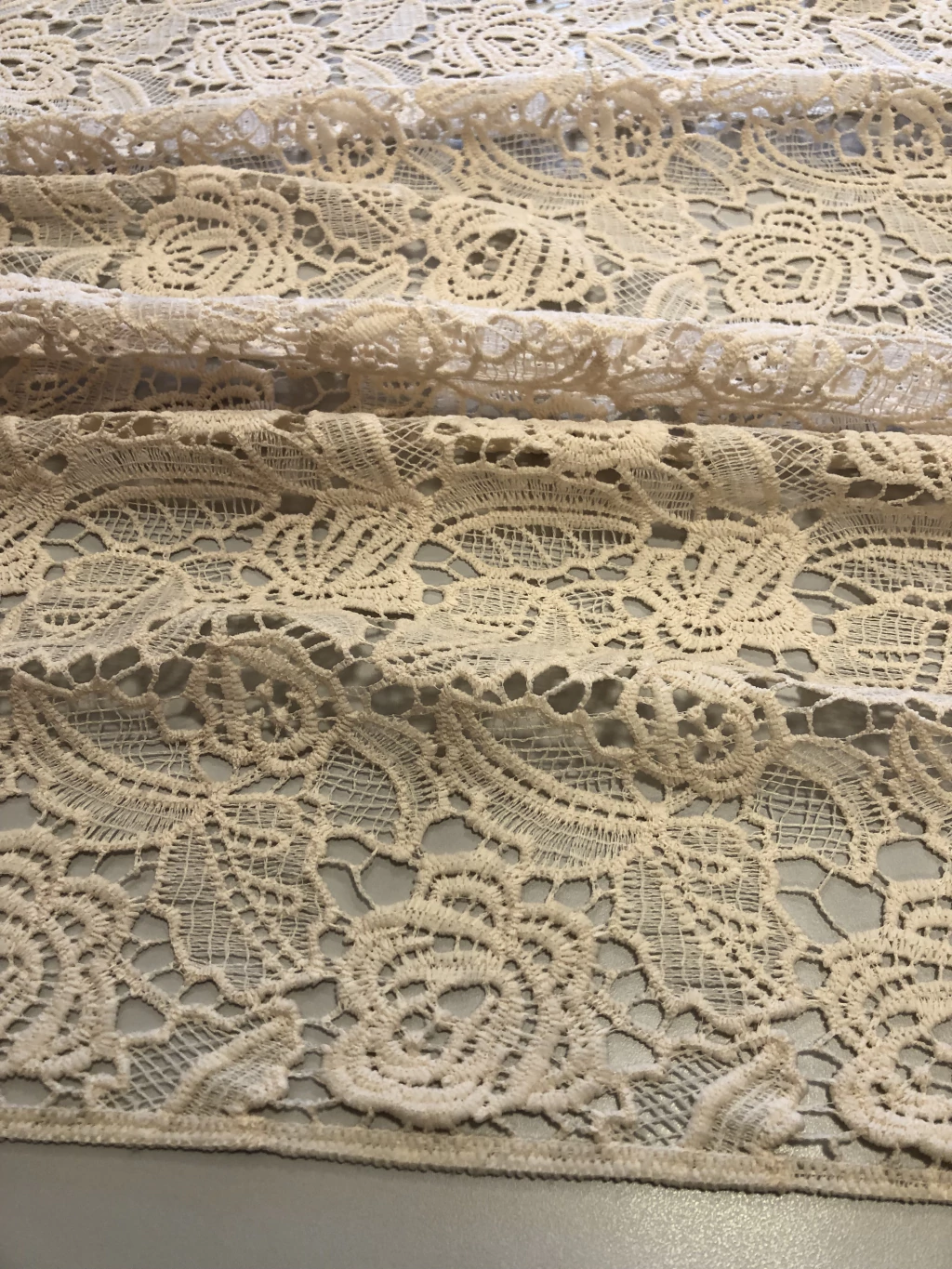 A Renda Guipure é um tecido conhecido por seus desenhos em relevo formados por fios trabalhados, sem fundo de tule. Rica em detalhes, possui aspecto rendado mais firme e estruturado, trazendo elegância e requinte às peças. É muito utilizada em vestidos de festa, noivas, detalhes em blusas, saias, aplicações e até em combinações com outros tecidos delicados.