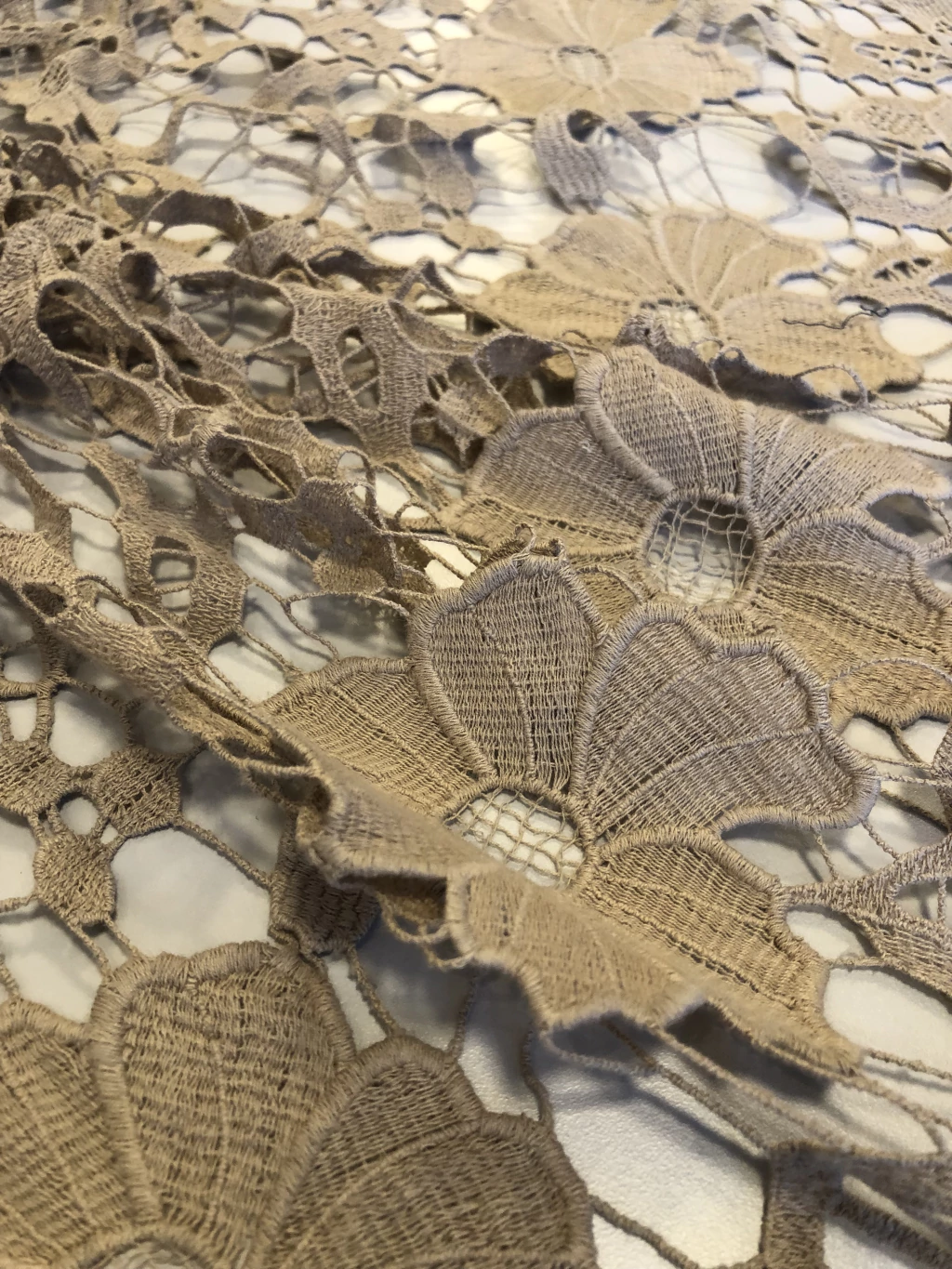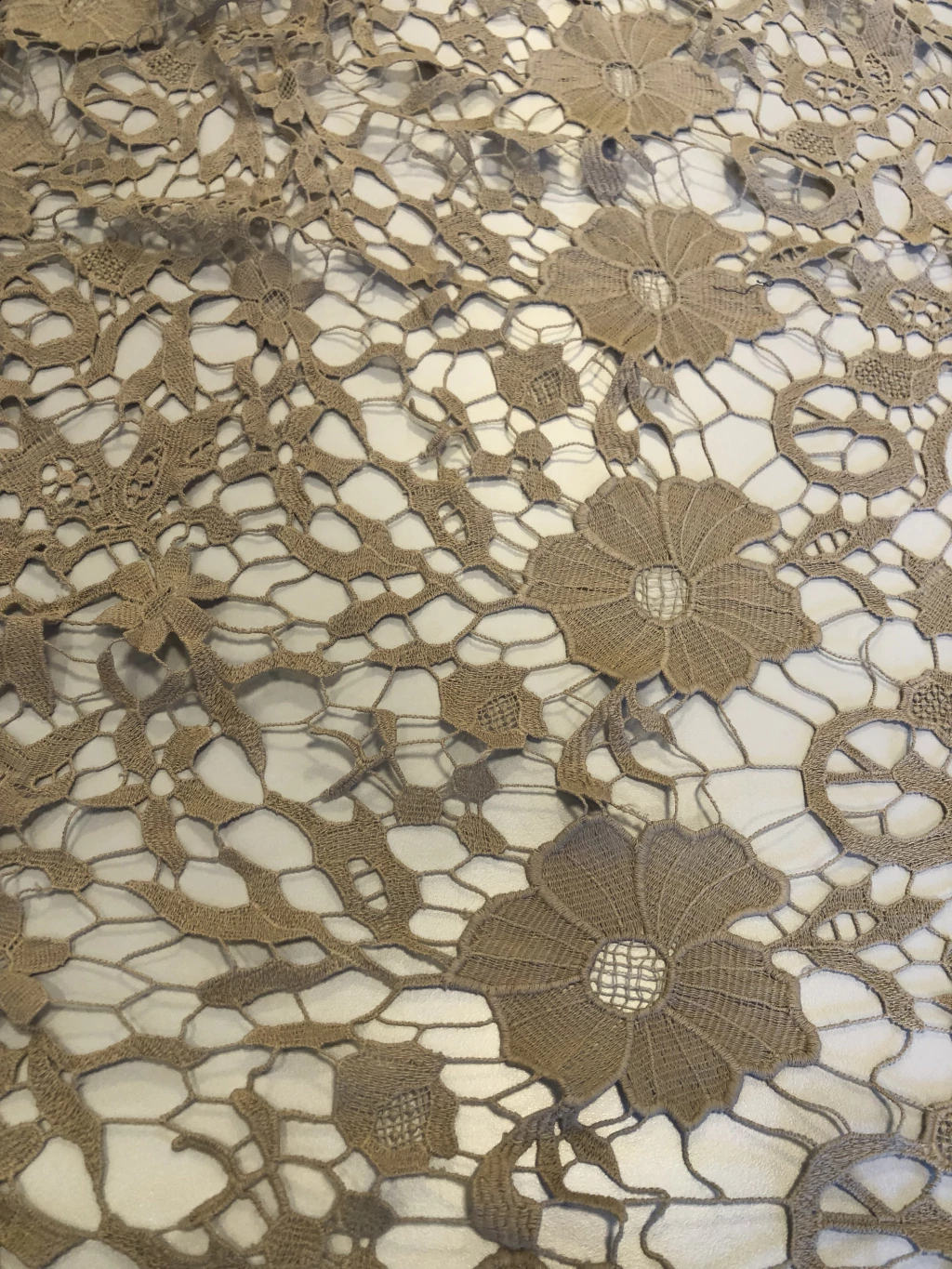 A Renda Guipure é um tecido conhecido por seus desenhos em relevo formados por fios trabalhados, sem fundo de tule. Rica em detalhes, possui aspecto rendado mais firme e estruturado, trazendo elegância e requinte às peças. É muito utilizada em vestidos de festa, noivas, detalhes em blusas, saias, aplicações e até em combinações com outros tecidos delicados.