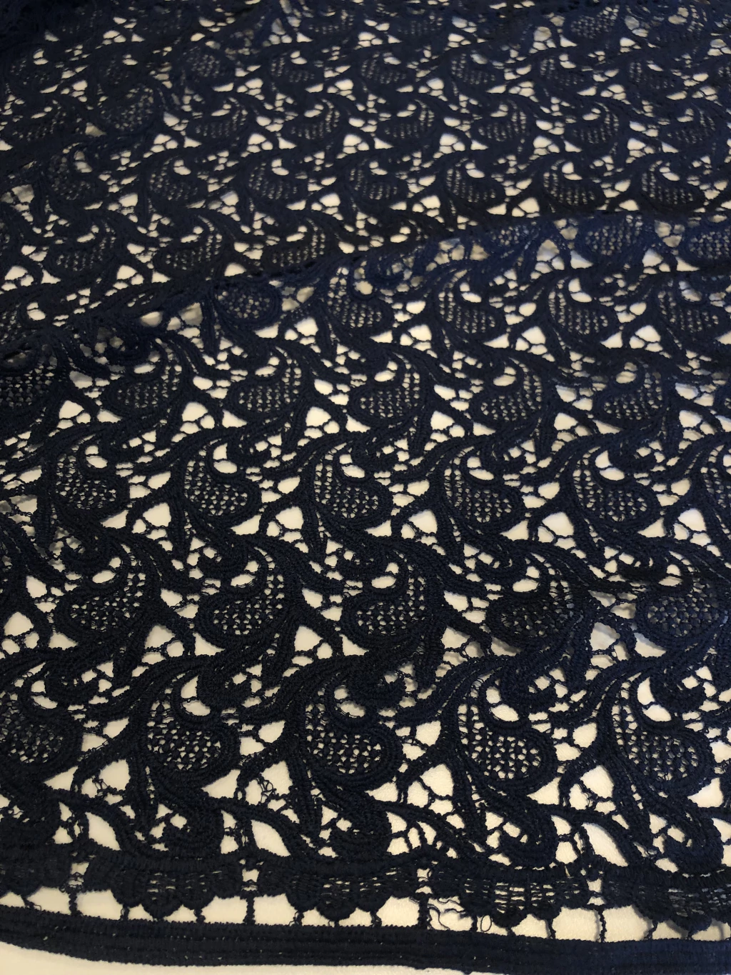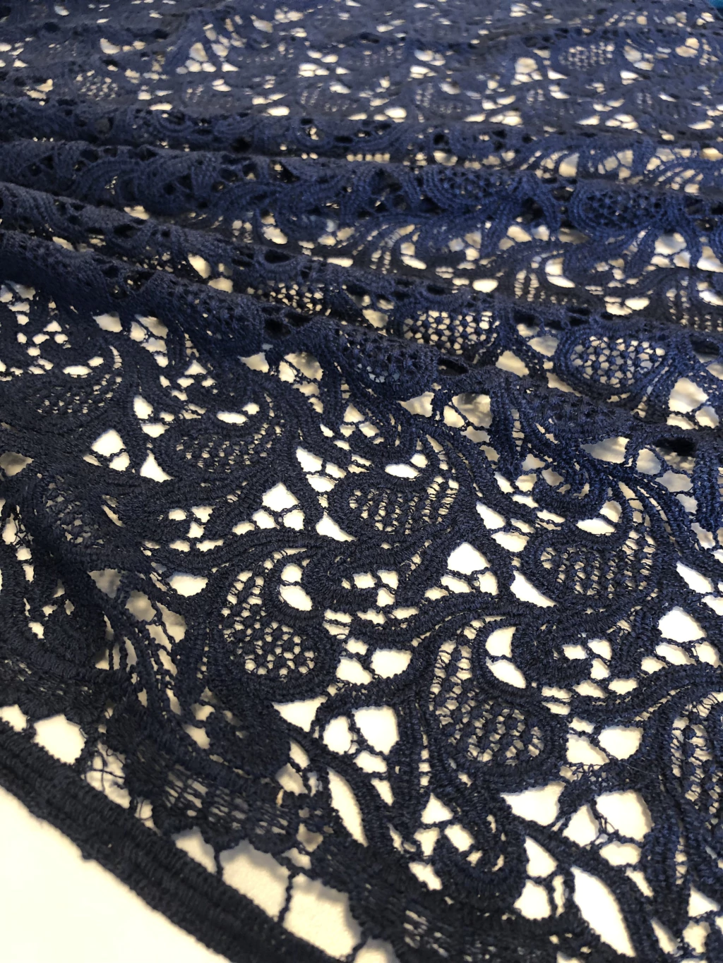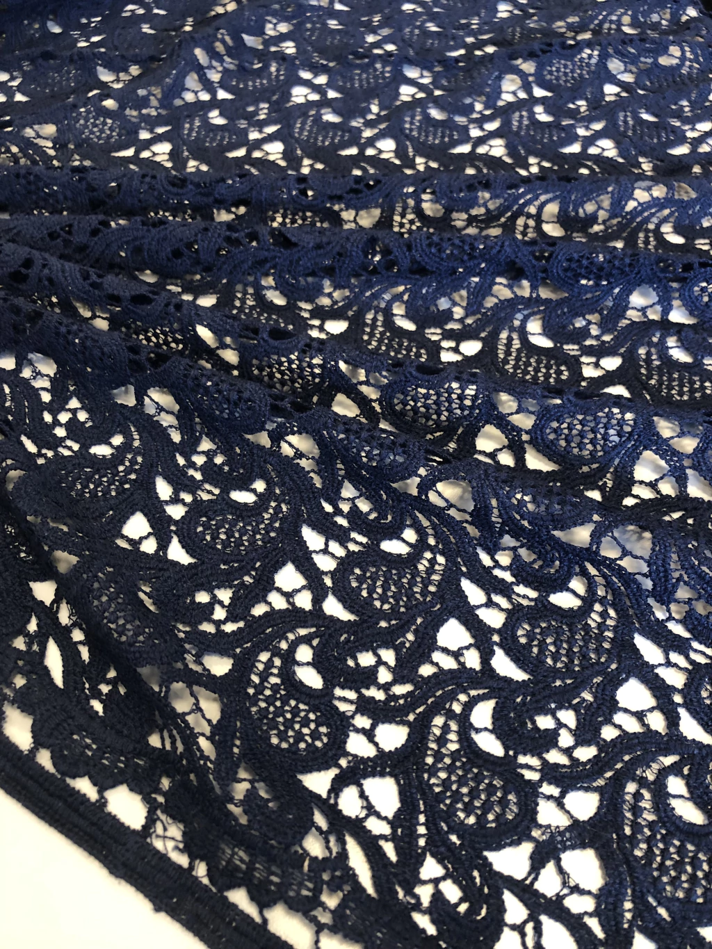 A Renda Guipure é um tecido conhecido por seus desenhos em relevo formados por fios trabalhados, sem fundo de tule. Rica em detalhes, possui aspecto rendado mais firme e estruturado, trazendo elegância e requinte às peças. É muito utilizada em vestidos de festa, noivas, detalhes em blusas, saias, aplicações e até em combinações com outros tecidos delicados.