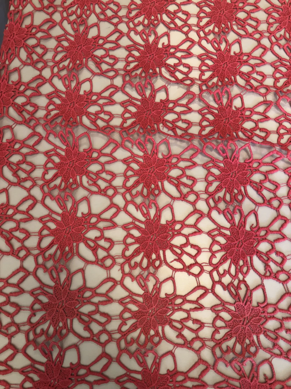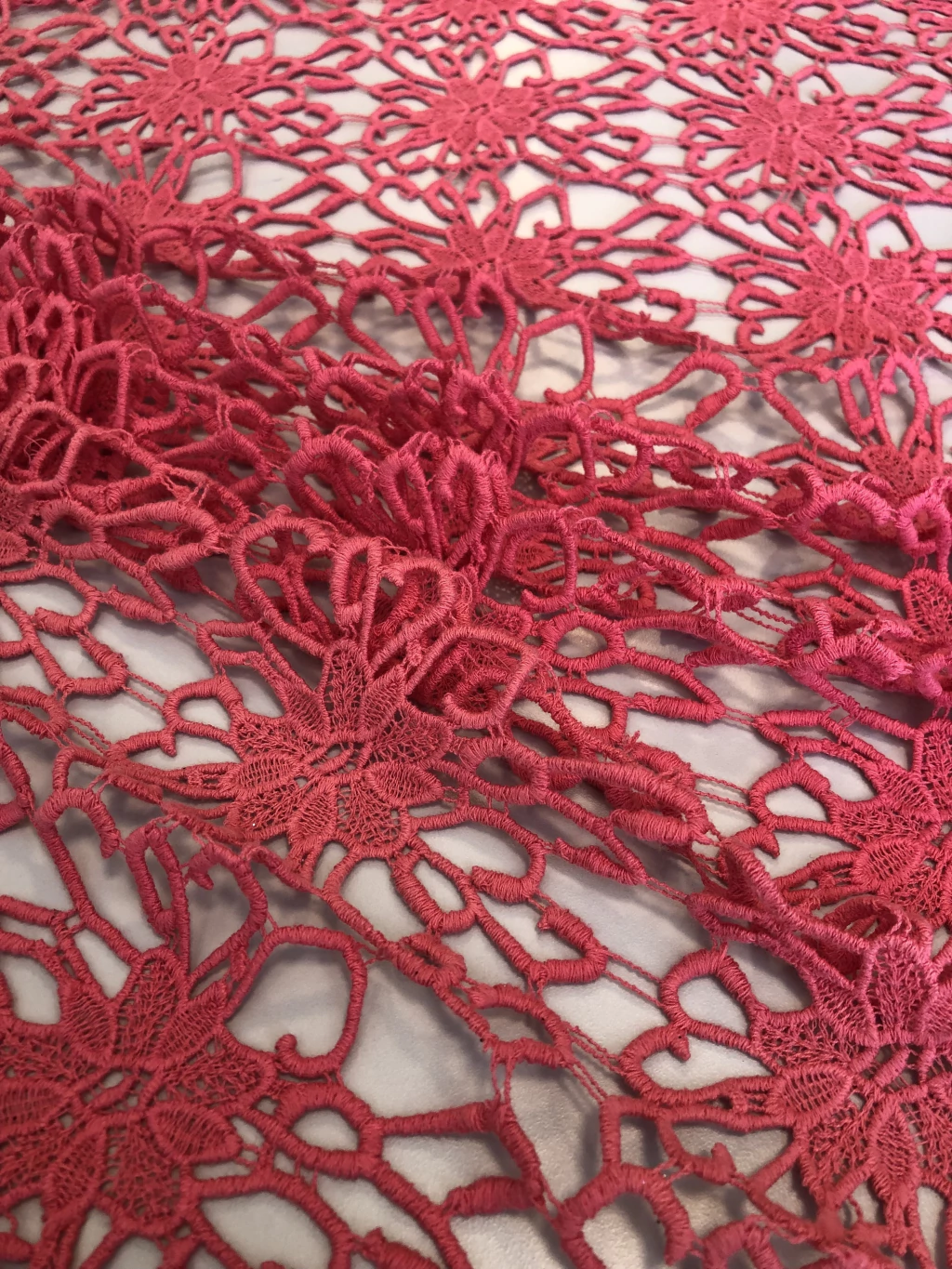 A Renda Guipure é um tecido conhecido por seus desenhos em relevo formados por fios trabalhados, sem fundo de tule. Rica em detalhes, possui aspecto rendado mais firme e estruturado, trazendo elegância e requinte às peças. É muito utilizada em vestidos de festa, noivas, detalhes em blusas, saias, aplicações e até em combinações com outros tecidos delicados.
